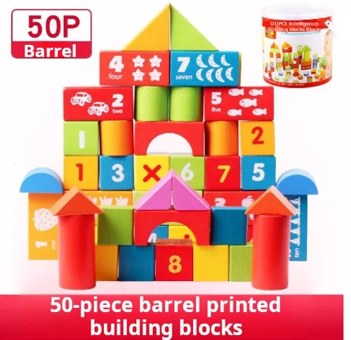 50 Pcs Wooden Barreled Number and Letter Transportation Vehicle Cognitive Building Block Toy